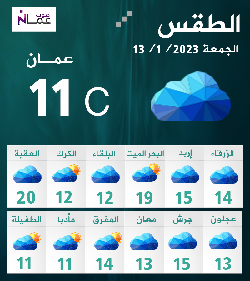 تكون الأجواء اليوم الجمعة، باردة في أغلب مناطق المملكة، ولطيفة الحرارة في الأغوار والبحر الميت والعقبة، مع ظهور الغيوم على ارتفاعات مختلفة، وتكون الرياح جنوبية غربية معتدلة السرعة .