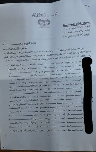 قرر مجلس الوزراء في جلسته المنعقدة 11 كانون الثاني إحالة عدد من الضباط في مديرية الأمن العام على التقاعد.