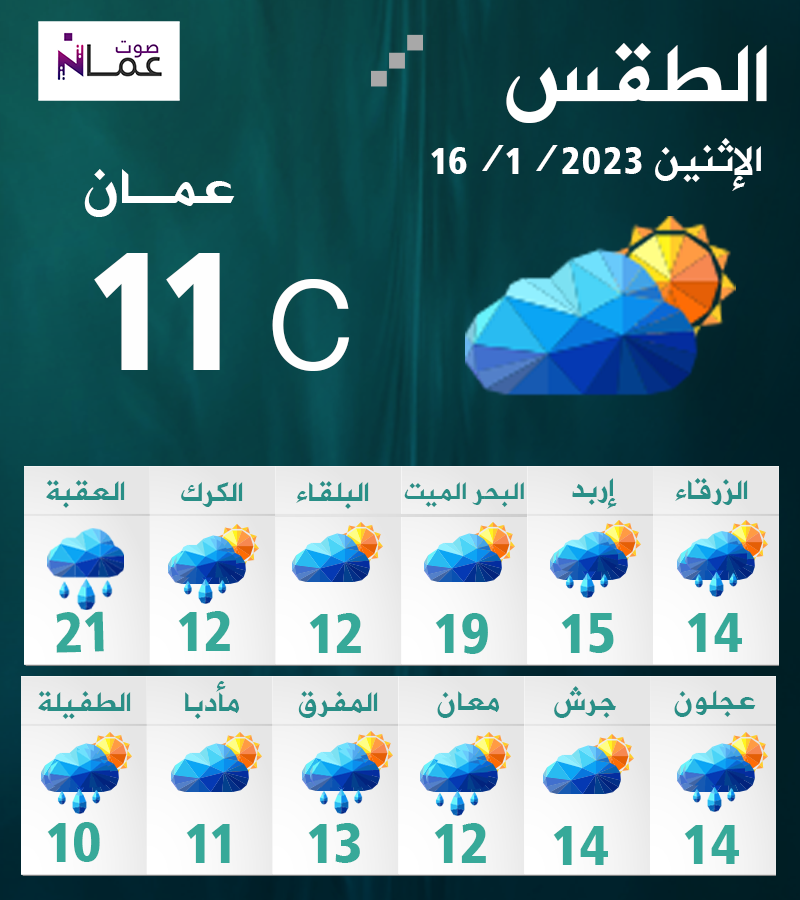 وخلال ساعات المساء تكون الأجواء باردة، مع ظهور الغيوم على ارتفاعات مختلفة، مع استمرار الفرصة لتساقط زخات من المطر في البادية الشمالية الشرقية قد تكون لفترة محدودة غزيرة، وتدريجيا تضعف فرصة هطول الامطار حيث تنتهي مع ساعات الليل المتاخرة، والرياح جنوبية غربية معتدلة السرعة تنشط احيانا في المناطق الشرقية.