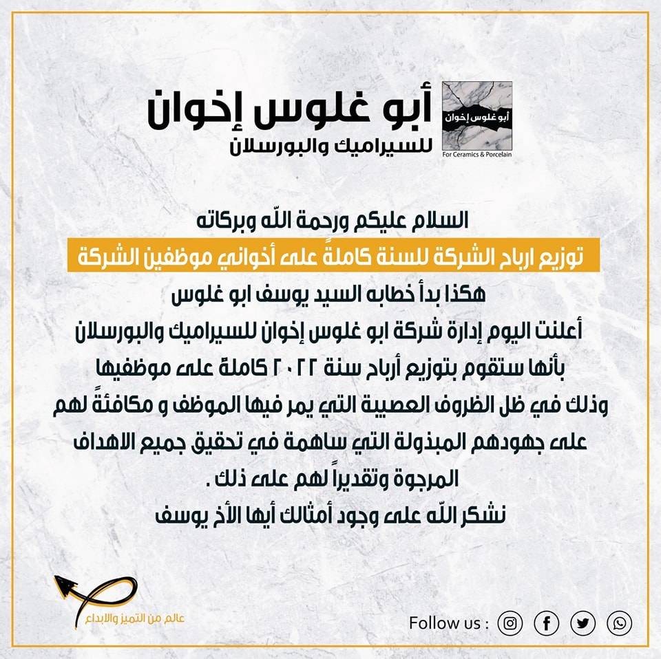 في سابقة تعد الأولى بين الشركات المحلية، أعلن يوسف ابو غلوس مالك شركة "أبو غلوس إخوان" للسيراميك والبورسلان، عن توزيع كامل أرباح الشركة السنوية لعام 2022 على موظفيه، الأمر الذي أثار الشارع الأردني بسبب هذه المبادرة الفريدة من نوعها، وكيفية تعامل الشركة وإدارتها التنفيذية مع العاملين بها.