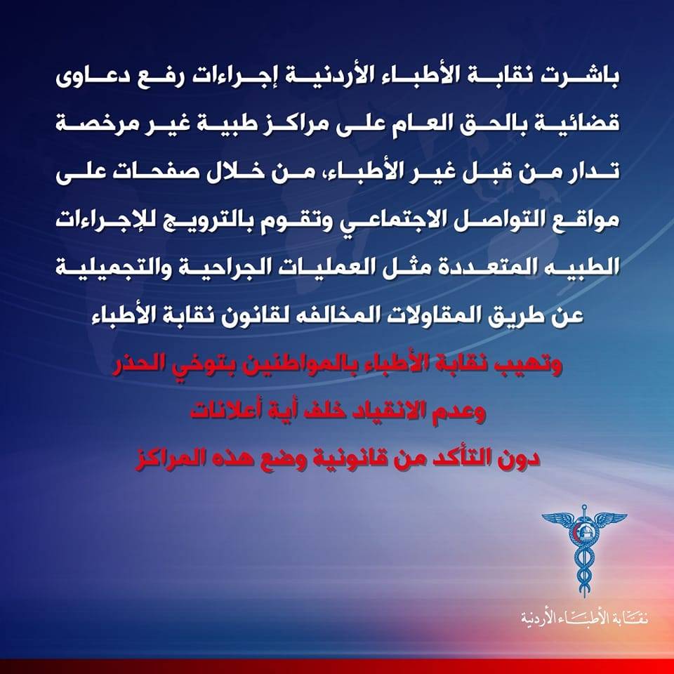 أعلنت نقابة الأطباء الأردنية الثلاثاء، رفع دعاوى قضائية بالحق العام على مراكز طبية غير مرخصة.