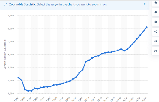 بينت نتائج توقعات بيانات لموقع (ستاتيستا) الالماني المتخصص في السوق والمستهلكين، ارتفاع نصيب المواطن الأردني من الناتج المحلي بشكل مستمر بين عامي 2022 و 2027 بإجمالي 1،442.9 دولار أمريكي بما يعادل 1024.30 دينار اردني.