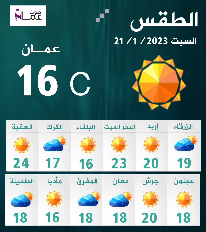 يوم غد الأحد، تكون الأجواء باردة نسبياً في أغلب المناطق، ولطيفة الحرارة في الأغوار والبحر الميت والعقبة مع ظهور بعض الغيوم على ارتفاعات منخفضة خاصة في شرق المملكة، والرياح جنوبية شرقية معتدلة السرعة تنشط أحياناً.