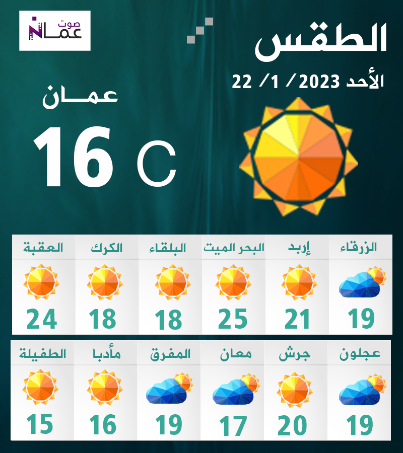 وبحسب الأرصاد الجوية، تبقى الأجواء باردة نسبياً في أغلب المناطق، ولطيفة الحرارة في الأغوار والبحر الميت والعقبة مع ظهور بعض الغيوم على ارتفاعات منخفضة خاصة في شرق المملكة.