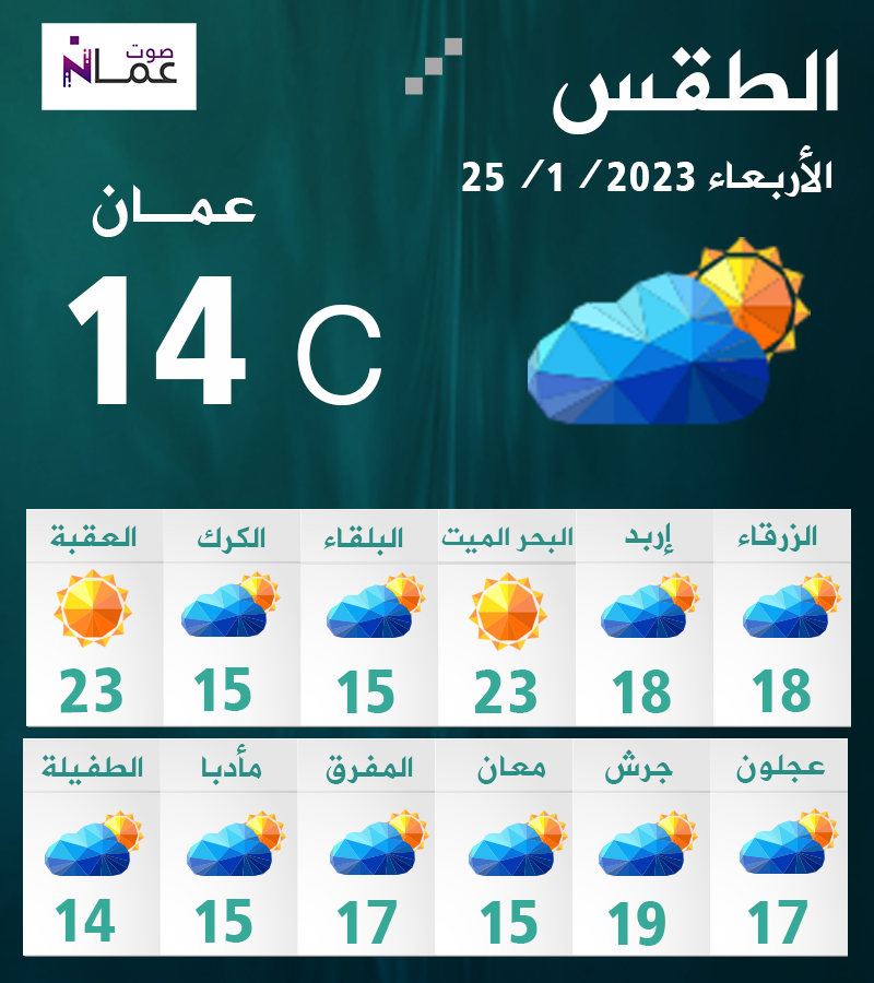يطرأ انخفاض طفيف على درجات الحرارة اليوم الأربعاء، وتستمر الأجواء مائلة للبرودة فوق المرتفعات الجبلية العالية، ولطيفة الحرارة في باقي المناطق، مع ظهور الغيوم على ارتفاعات مختلفة في شمال وشرق المملكة، مع احتمالية ضعيفة لهطول زخات خفيفة من المطر في أجزاء محدودة من المناطق الشرقية والشمالية من المملكة لفترة قصيرة، وتكون الرياح جنوبية شرقية معتدلة السرعة.