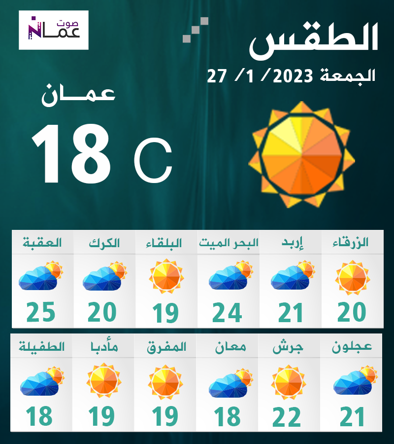 يوم غدٍ السبت، يطرأ ارتفاع طفيف على درجات الحرارة، وتكون الأجواء لطيفة الحرارة في معظم المناطق، ودافئة نسبيا في الأغوار والبحر الميت والعقبة وتظهر كميات من الغيوم على ارتفاعات متوسطة وعالية، وتكون الرياح جنوبية غربية نشطة السرعة مثيرة للغبار خاصة في مناطق البادية.