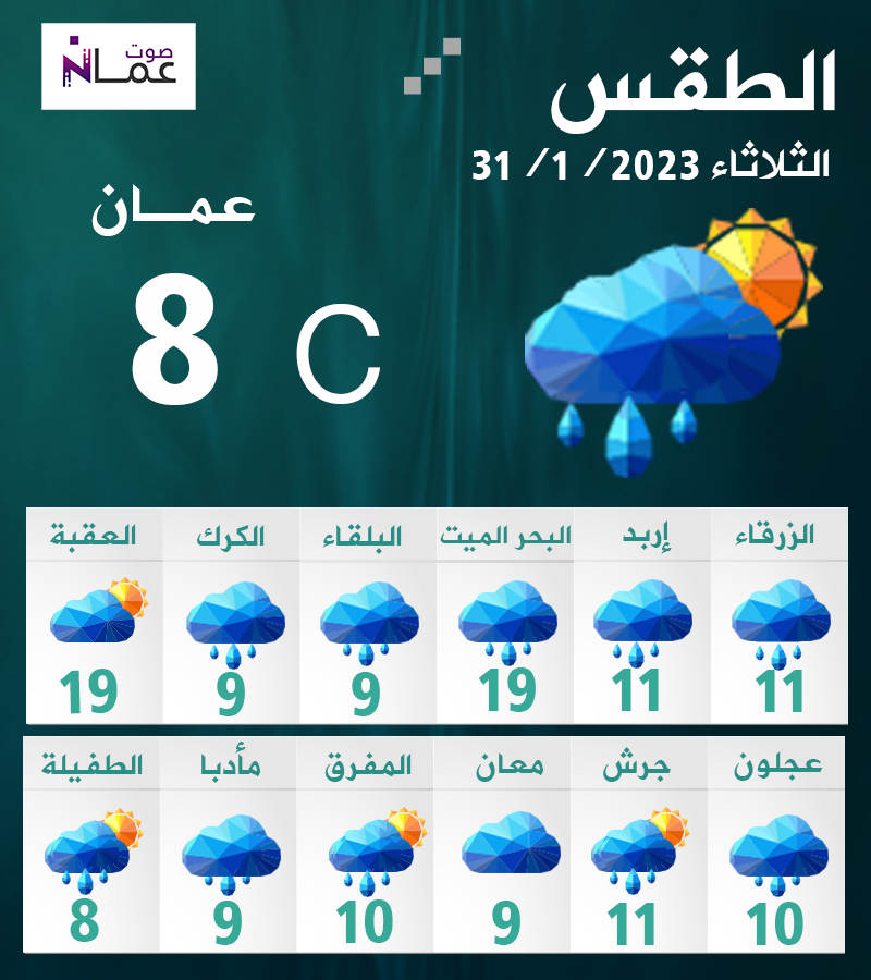 وبحسب "طقس العرب"، تعبر جبهة هوائية باردة في ساعات الصباح، بحيث يكون الطقس بارداً وعاصفاً وغائماً و ماطراً في شمال ووسط الأردن، يصاحبها هطول لزخات مطرية غزيرة ومترافقة مع تساقط لزخات من البَرَد، وتدريجيا مع ساعات ما بعد الظهر والعصر تمتد الأمطار بحدة أقل نحو أجزاء من البادية الشمالية ومرتفعات الكرك والطفيلة، فيما قد تكون ممزوجة بالثلوج في قمم الطفيلة.