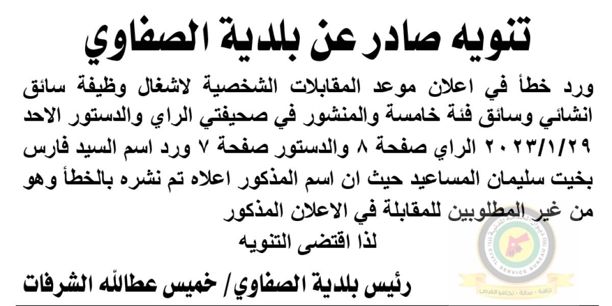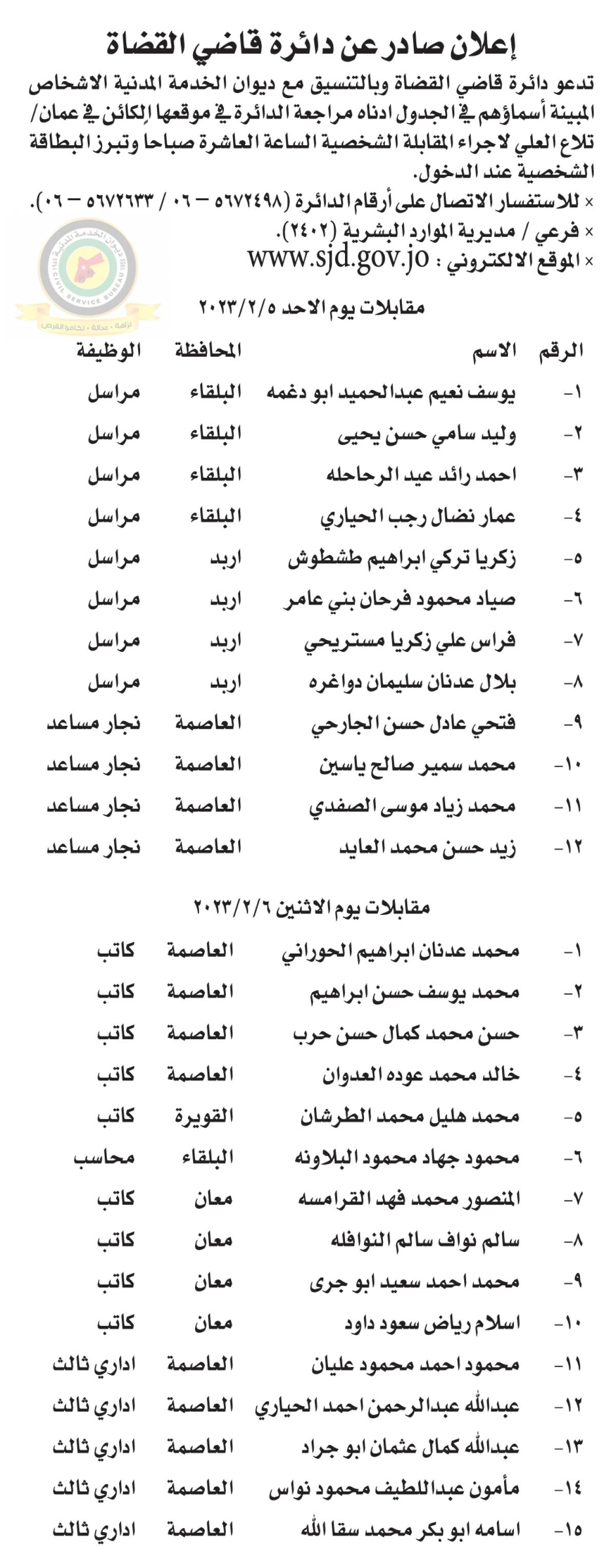 وجه ديوان الخدمة المدنية، دعوة وبالتعاون مع مختلف الوزارات والمؤسسات الحكومية، للأشخاص التالية أسماؤهم، لاجراء المقابلات الشخصية وعقد الامتحان التنافسي لغايات التعيين.