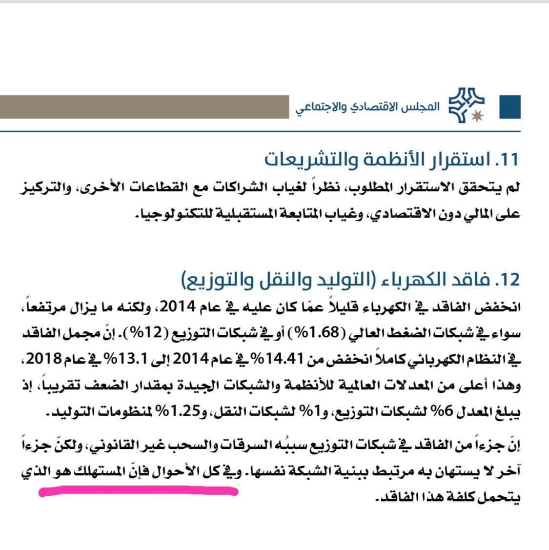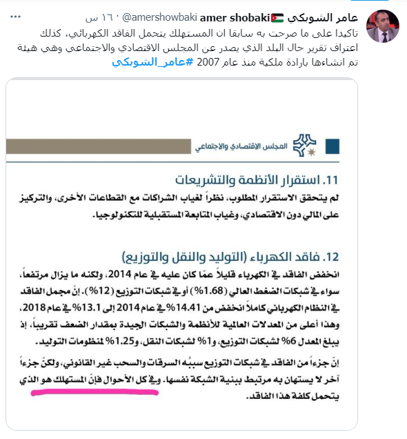 ونشر الشوبكي صورة للتقرير الصادر عن المجلس الاقتصادي في البند رقم ١٢ تحت عنوان (فاقد الكهرباء التوليد والنقل والتوزيع) والذي أكد فيه المجلس أن الفاقد في الكهرباء انخفض قليلاً عما كان عليه في عام 2014، ولكنه ما يزال مرتفعاً، سواء في شبكات الضغط العالي (1.68%) أو في شبكات التوزيع (12%).