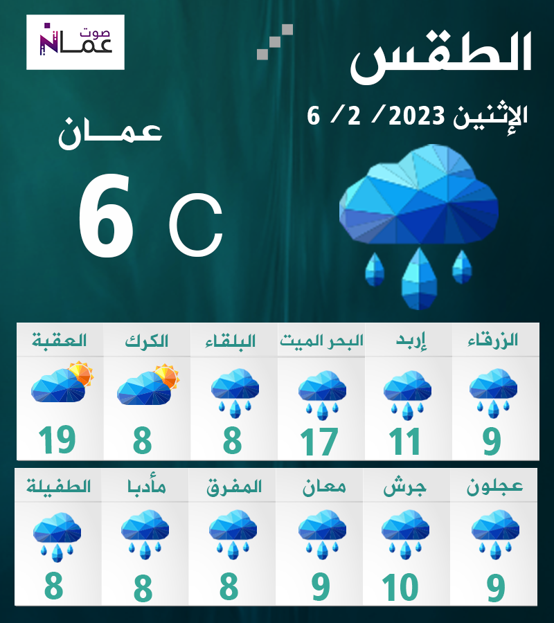 وبحسب الأرصاد الجوية، تكون الأجواء باردة جداً وغائمة جزئياً تتحول الى غائمة مع هطول زخات من المطر في شمال ووسط المملكة وأجزاء محدودة من المناطق الجنوبية الغربية، كما تسود رياح جنوبية غربية نشطة السرعة مع هبات قوية أحياناً قد تتجاوز سرعتها 90كم/س، مما يؤدي إلى تشكل العواصف الغبارية خاصة في المناطق الجنوبية والشرقية من المملكة.