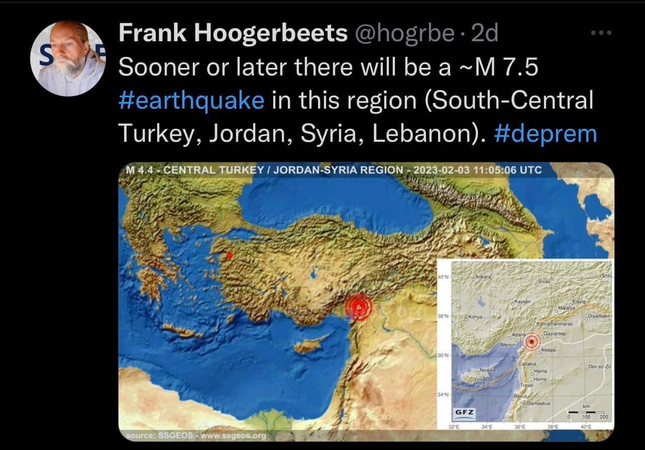 وأشار فرانك هوجربتس في تغريدة على صفحته في موقع التواصل الاجتماعي "تويتر" يوم 3 فبراير: "عاجلا أم آجلا ، سيحدث زلزال بقوة 7.5 درجة مئوية في هذه المنطقة (جنوب وسط تركيا والأردن وسوريا ولبنان)".