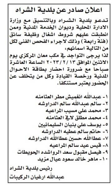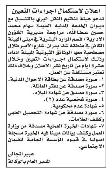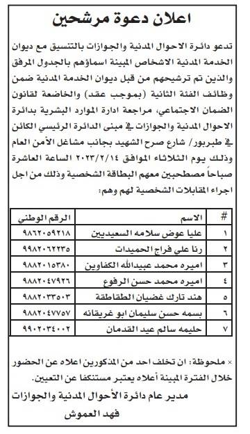 أعلنت عدة مؤسسات حكومية، وبالتنسيق مع ديوان الخدمة المدنية،اليوم الخميس، عن دعوة عدد من المرشحين للتعيين لمراجعتها، وذلك لاستكمال إجراءات تعيينهم.