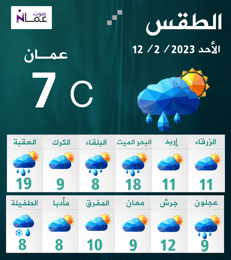 يطرأ انخفاض طفيف على درجات الحرارة، نهار اليوم الأحد، ويكون الطقس بارد جداً وغائم جزئياً في أغلب المناطق، مع احتمال هطول زخات خفيفة ومتقطعة من المطر في الأجزاء الغربية من المملكة.