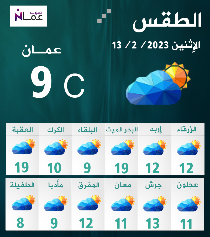 تكون الأجواء اليوم الإثنين باردة جداً وغائمة جزئياً في أغلب مناطق الأردن، وتسجل درجات الحرارة أقل من معدلاتها العامة لمثل هذا الوقت من العام بحوالي (3-4) درجات مئوية.
