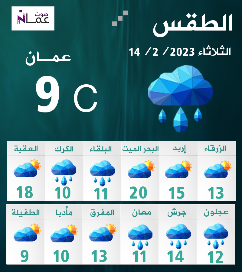 وبحسب الأرصاد الجوية، يتأثر الأردن في ساعات الليل، بحالة من عدم الاستقرار الجوي، حيث تتكاثر كميات الغيوم، ويتوقع هطول زخات من المطر في جنوب المملكة قد تكون غزيرة لفترة قصيرة وتمتد تدريجيا إلى المناطق الوسطى والشرقية، قد تكون غزيرة أحيانا يصحبها الرعد احيانا وتساقط حبات البرد، وهناك احتمال ضعيف في ساعات الليل فوق قمم الجبال الجنوبية العالية (الشراة) لسقوط زخات خفيفة ومتقطعة وغير مؤثرة من الثلج الممزوج مع المطر المتجمد، وتكون الرياح شمالية غربية معتدلة السرعة تنشط على فترات قد تثير الغبار في مناطق البادية.