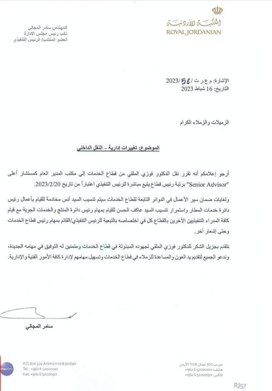 قررت إدارة الملكية الأردنية نقل الدكتور فوزي هاني الملقي من قطاع الخدمات إلى مكتب المدير العام للعمل كمستشار أعلى برتبة رئيس قطاع.