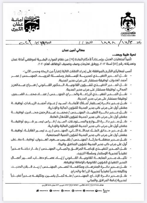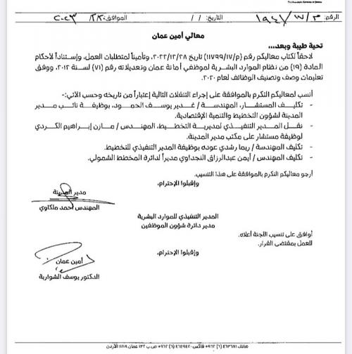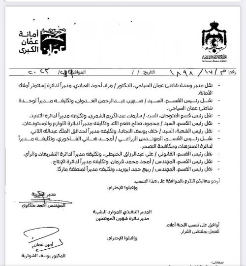 وقرر أمين عمان،الدكتور يوسف الشواربة، نقل مستشارين وتكليف نواب لمدير المدينة وتكليف مديرين تنفيذيين ومديري دوائر.