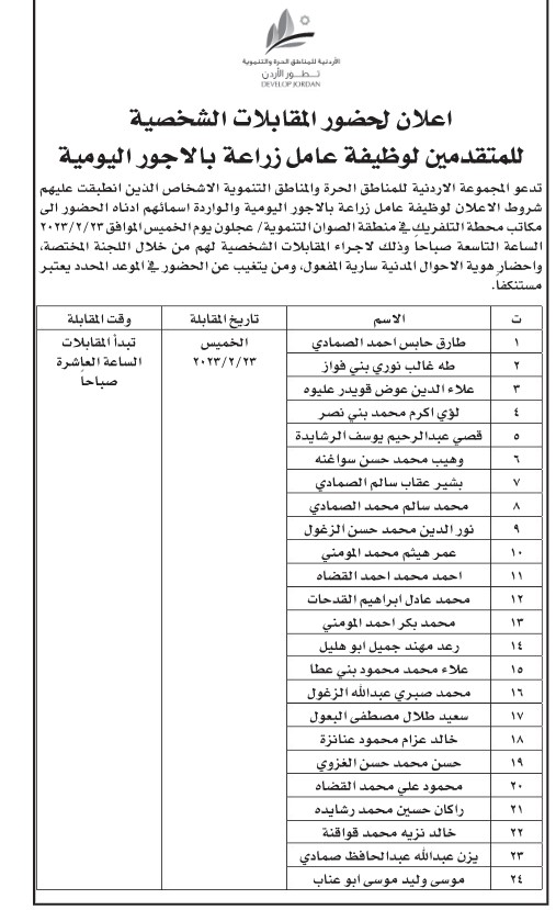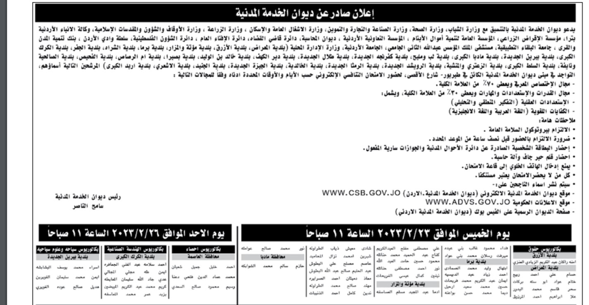 وجه ديوان الخدمة المدنية بالتنسيق مع عدة وزارات ومؤسسات حكومية، دعوة لمئات المرشحين لحضور الامتحان التنافسي لغايات التعيين والمقابلات الشخصية.