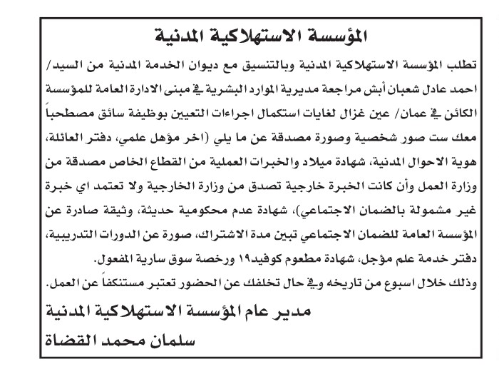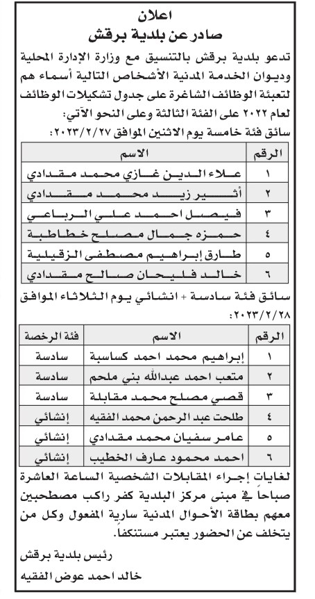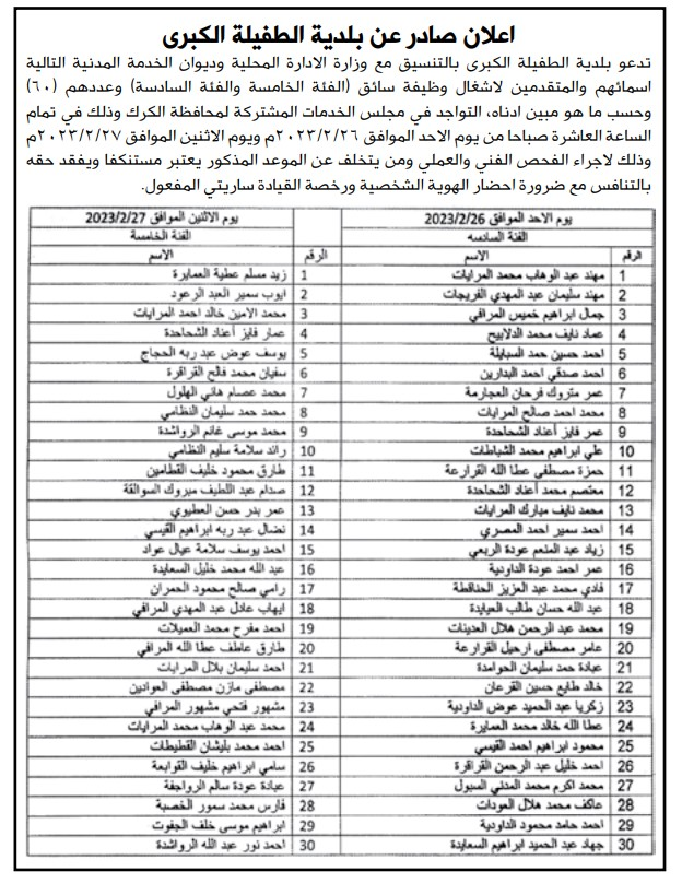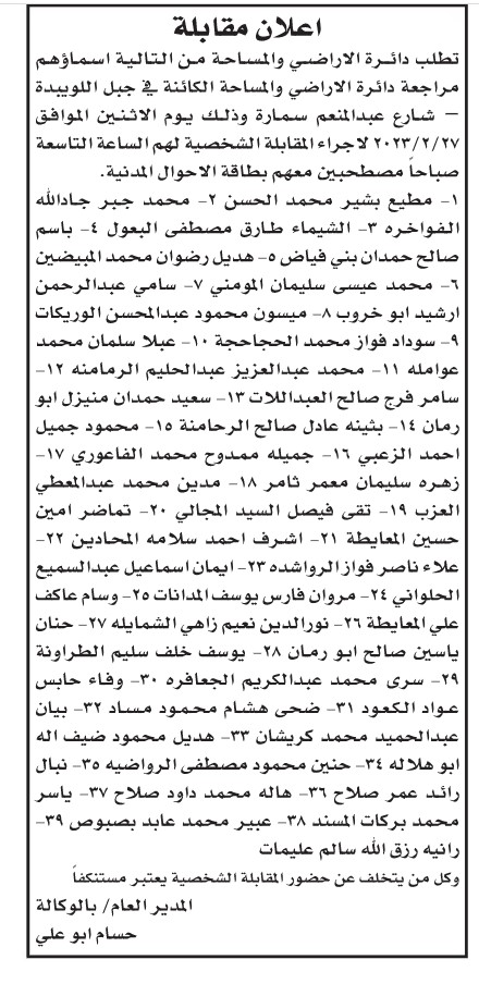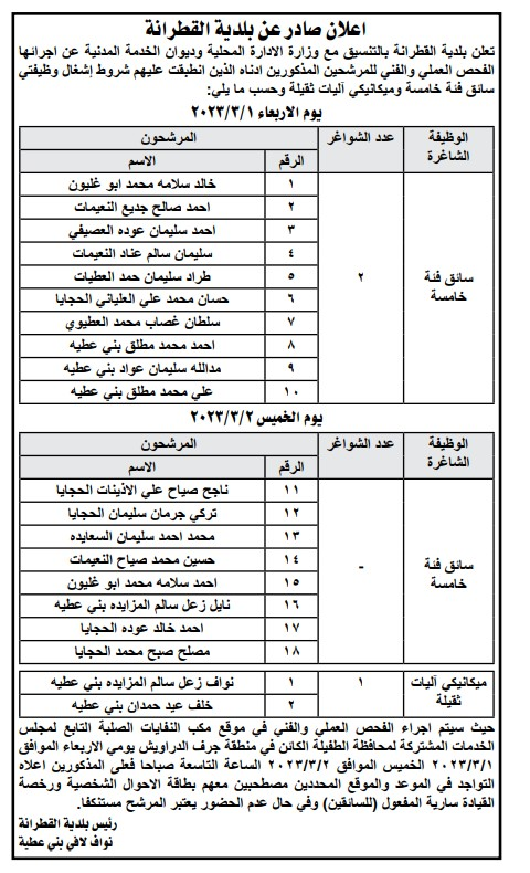 دعا ديوان الخدمة المدنية بالتنسيق مع عدد من الوزارات والمؤسسات الحكومية الأشخاص التالية للتعيين وإجراء المقابلات الشخصية.