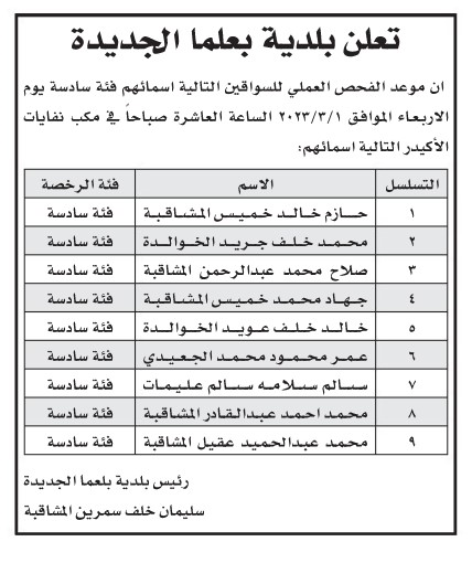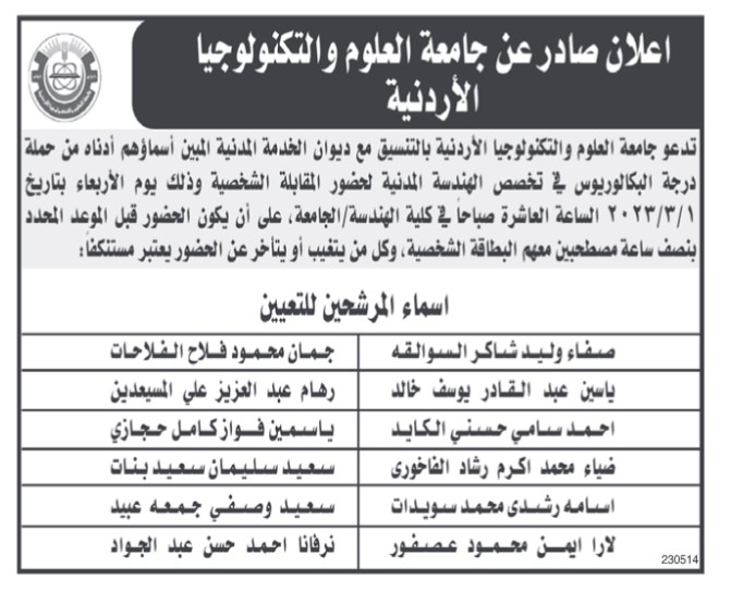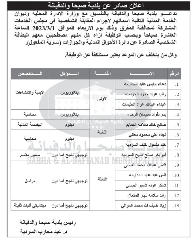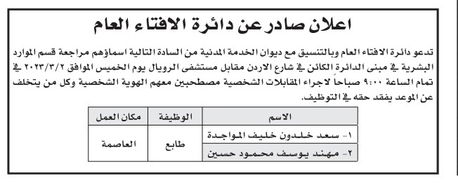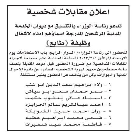 وجه ديوان الخدمة المدنية بالتنسيق مع عدد من الوزارات والمؤسسات الحكومية، دعوة للأشخاص التالية للتعيين وإجراء المقابلات الشخصية.