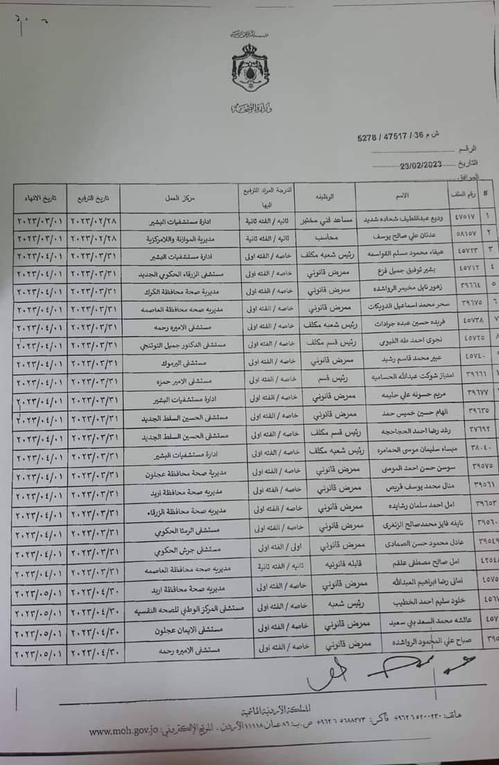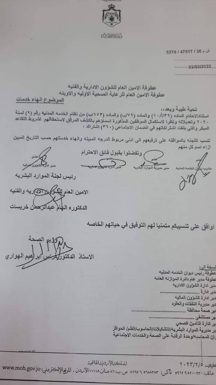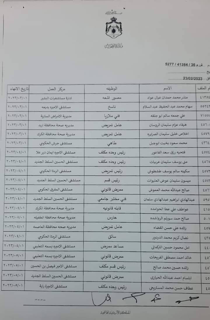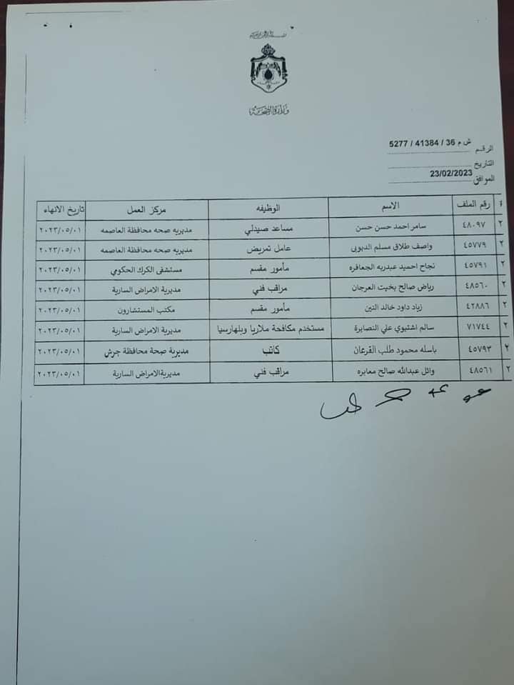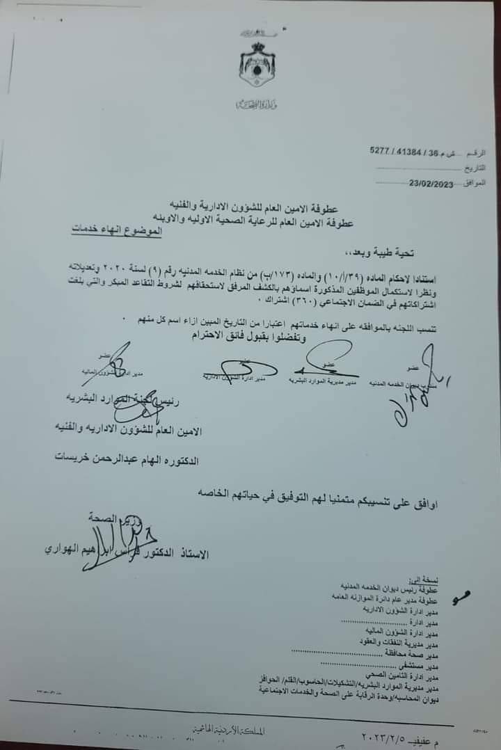 قرر وزير الصحة الدكتور فراس الهواري انهاء خدمات عدد من موظفي وزارة الصحة بناء على تنسيب من الامين العام اعتبارا من التاريخ المبين ازاء كل اسم :