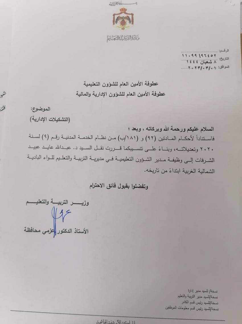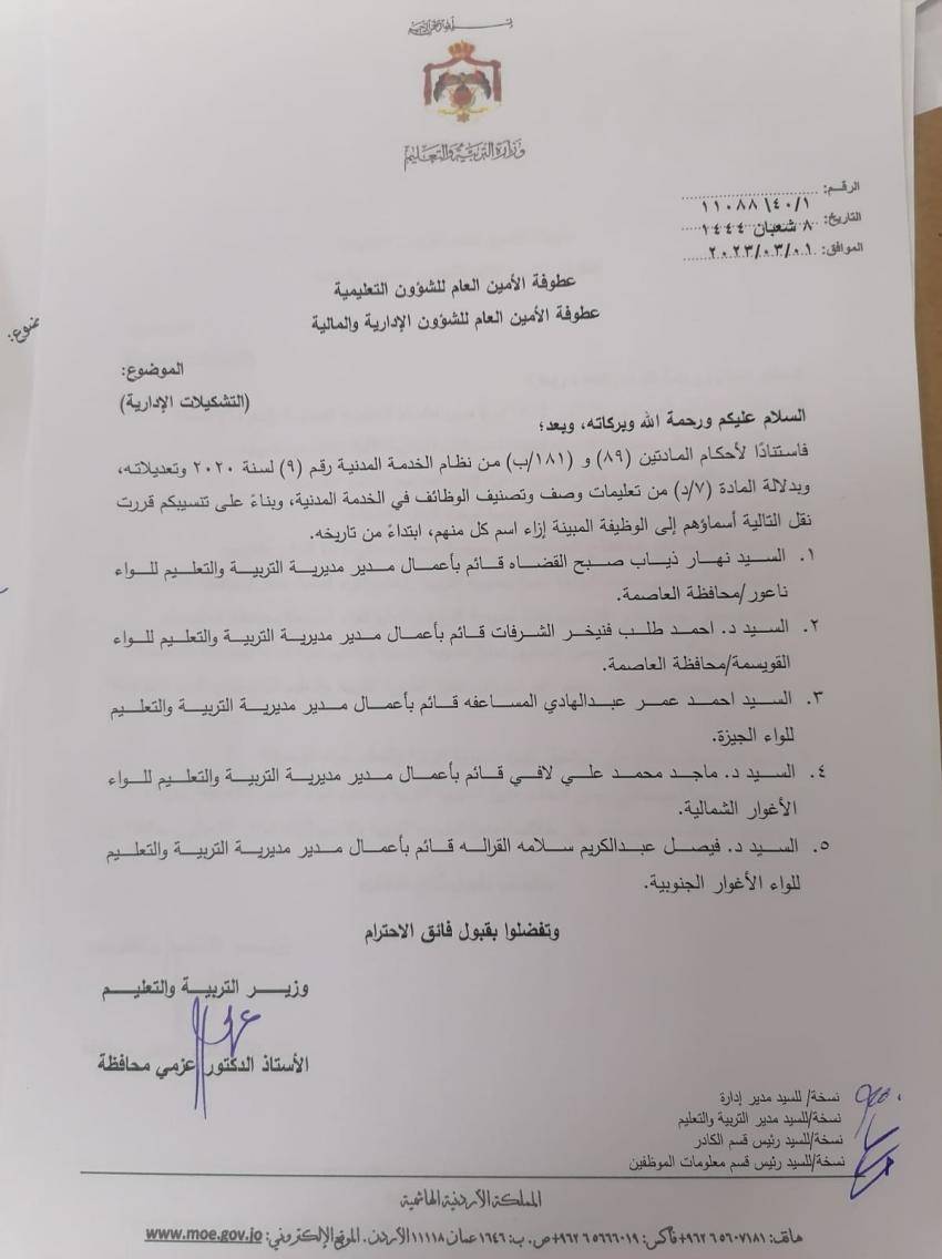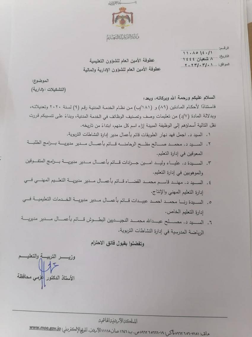 قرر وزير التربية والتعليم والتعليم العالي والبحث العلمي، الدكتور عزمي محافظة، اجراء تشكيلات في الوزارة.