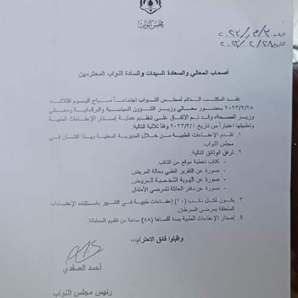 أظهر كتاب رسمي موجه من رئيس مجلس النواب، أحمد الصفدي إلى النواب يوضح آلية جديدة بشأن تقديم طلبات النواب الخاصة بالإعفاءات الطبية.
