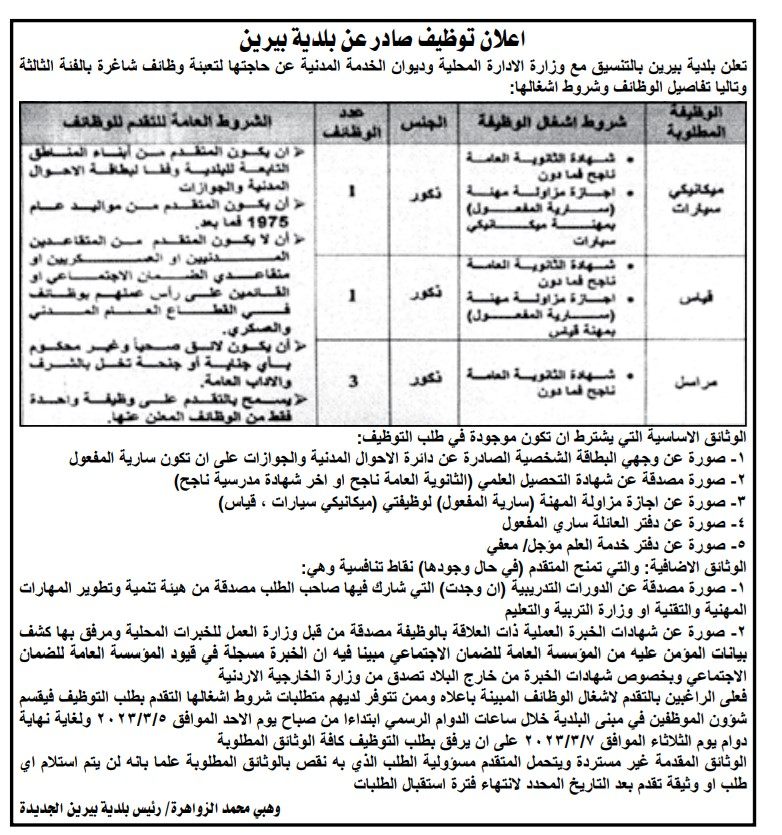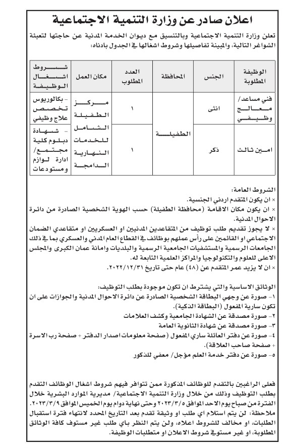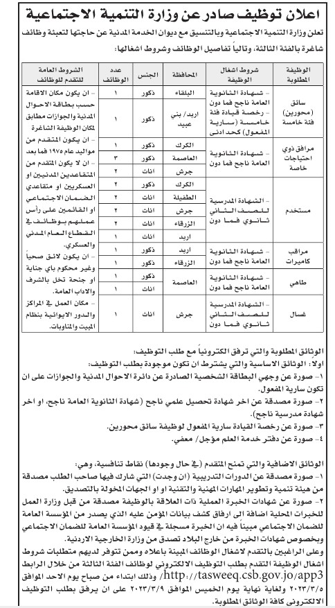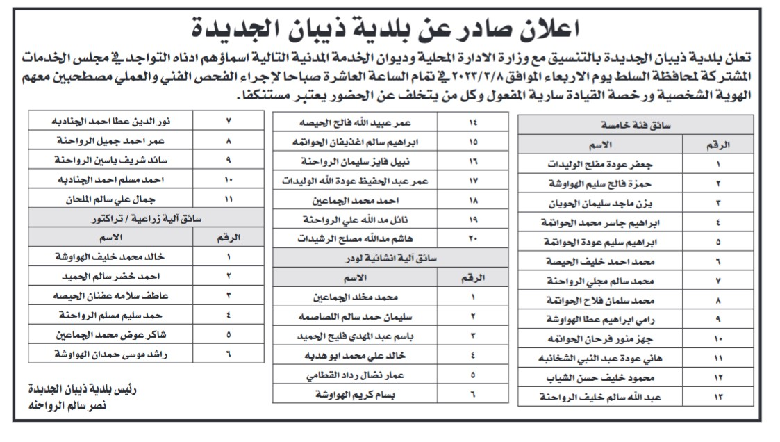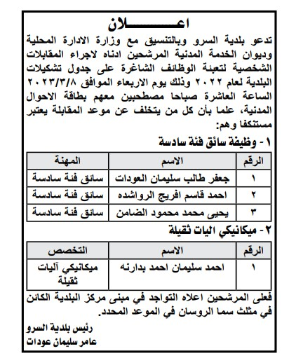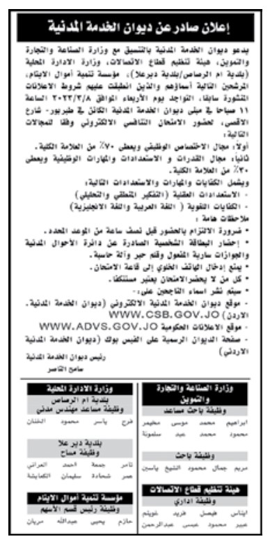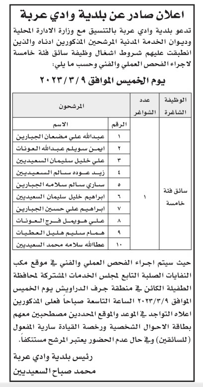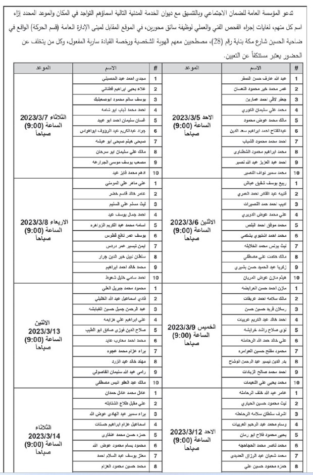 دعا ديوان الخدمة المدنية بالتنسيق مع عدد من وزارات ومؤسسات حكومية الأشخاص التالية لإجراء المقابلات الشخصية والفحص الفني.