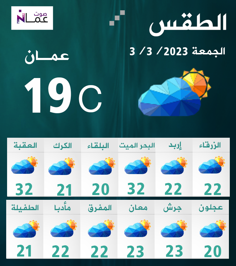 يطرأ اليوم الجمعة، انخفاض على درجات الحرارة لتسود أجواء لطيفة في المناطق الجبلية والسهول، بينما تبقى دافئة في البادية والأغوار والبحر الميت والعقبة مع ظهور الغيوم على ارتفاعات عالية، وتكون الرياح جنوبية غربية معتدلة إلى نشطة السرعة مع هبات قوية أحيانا مثيرة للغبار في العديد من المناطق خاصة في مناطق البادية مما يؤدي إلى تدنى مدى الرؤية الأفقية.