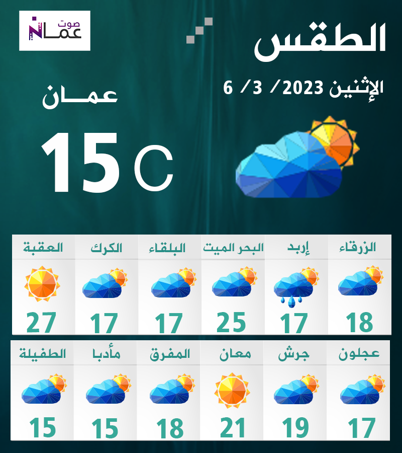 وبحسب "طقس العرب"، تكون الأجواء لطيفة وغائمة جزئية في بعض المناطق، وتميل إلى البرودة فوق المرتفعات، مع احتمالية هطول زخات محلية متفرقة من الأمطار في ساعات الصباح بأقصى شمال الأردن.