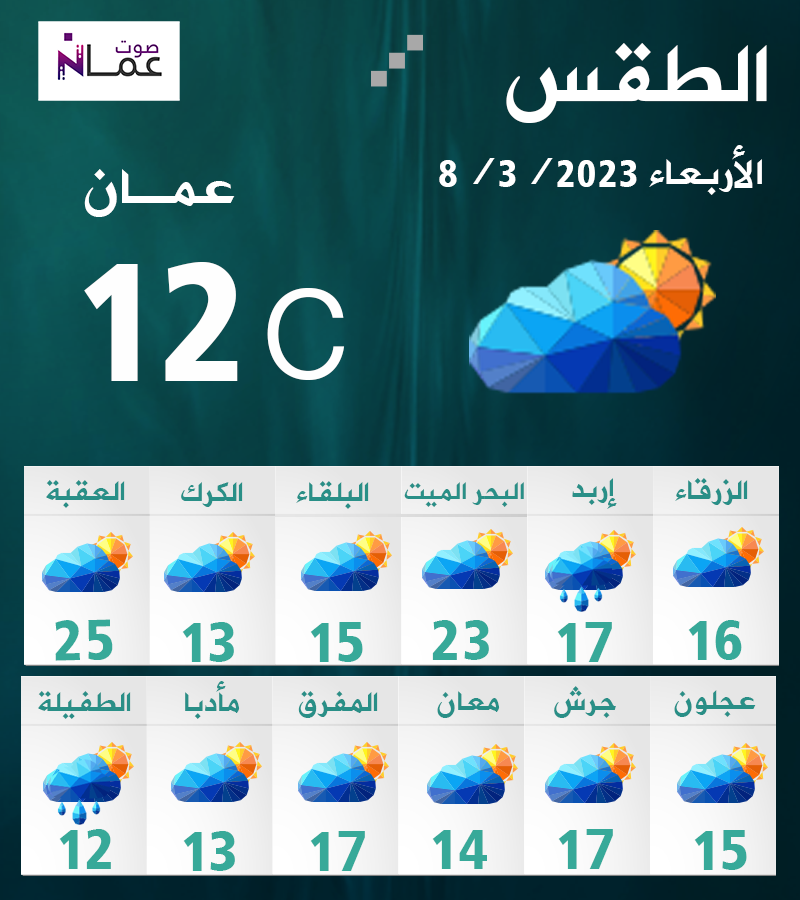 وبحسب "الأرصاد الجوية"، تظهر الغيوم على ارتفاعات مختلفة مع احتمال ضعيف لسقوط زخات خفيفة من المطر في شمال المملكة، وتتأثر مناطق أقصى شرق المملكة بحالة من عدم الاستقرار الجوي، حيث يتوقع ان تشهد تساقط زخات من المطر على فترات قد يصحبها الرعد وتساقط حبات من البرد احياناً، والرياح شمالية غربية معتدلة السرعة تنشط بعد الظهر وتكون مثيرة للغبار في مناطق البادية.