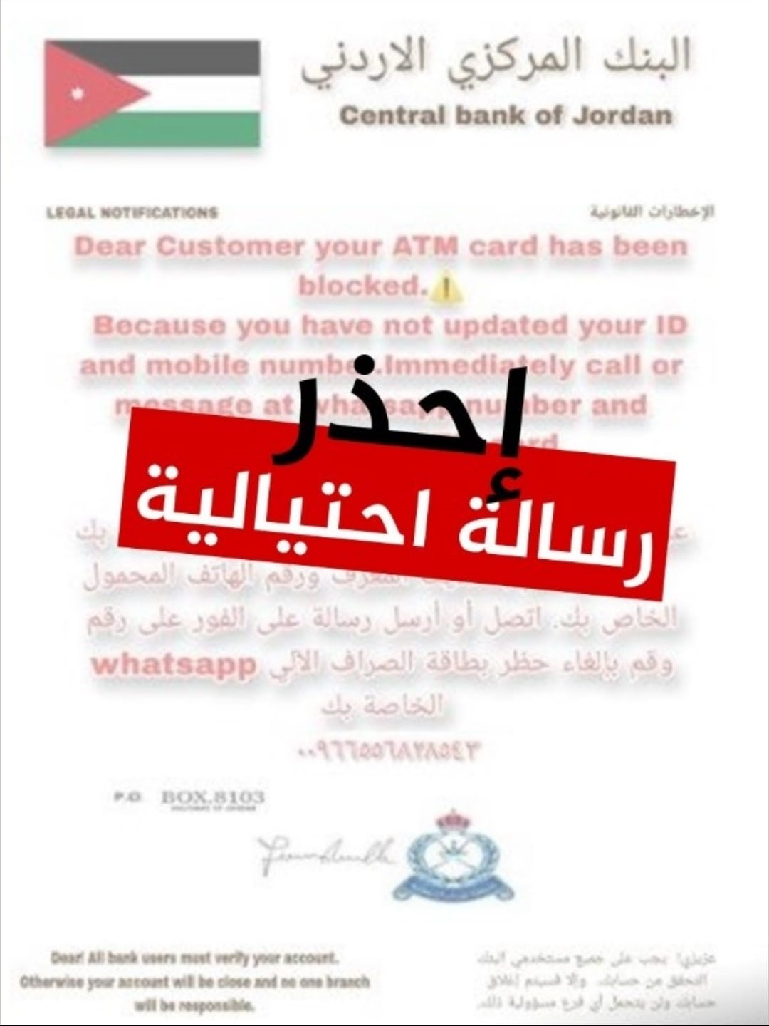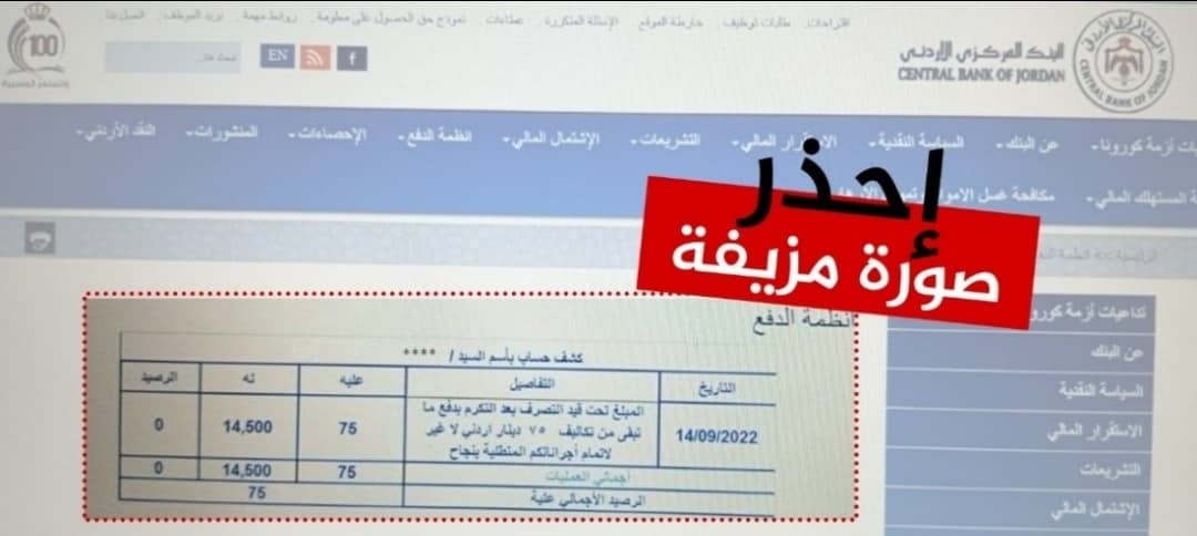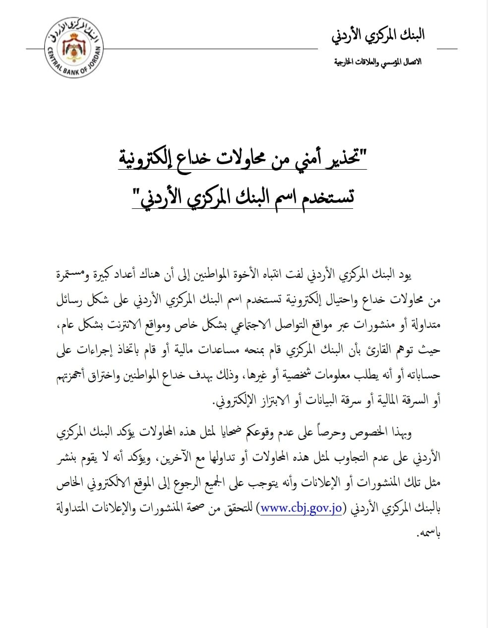 حذر البنك المركزي الأردني، من محاولات خداع إلكترونية مالية تستخدم اسم البنك.