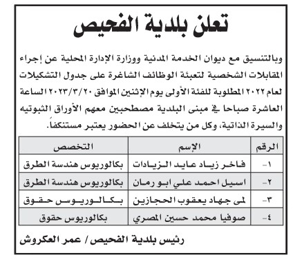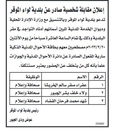 كما دعا ديوان الخدمة المدني بالتنسيق مع عدد من الوزارات والمؤسسات الحكومية الأشخاص التالية لإجراء المقابلات الشخصية.