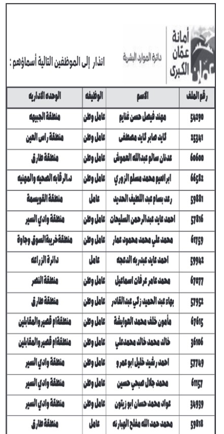 أنذرت أمانة عمان الكبرى، اليوم الأحد، 29 عاملا، بالعودة إلى عملهم خلال 3 أيام، وإلا سيتم فصلهم نتيجة تغيبهم عن العمل لمدة تزيد على 10 أيام.
