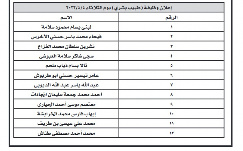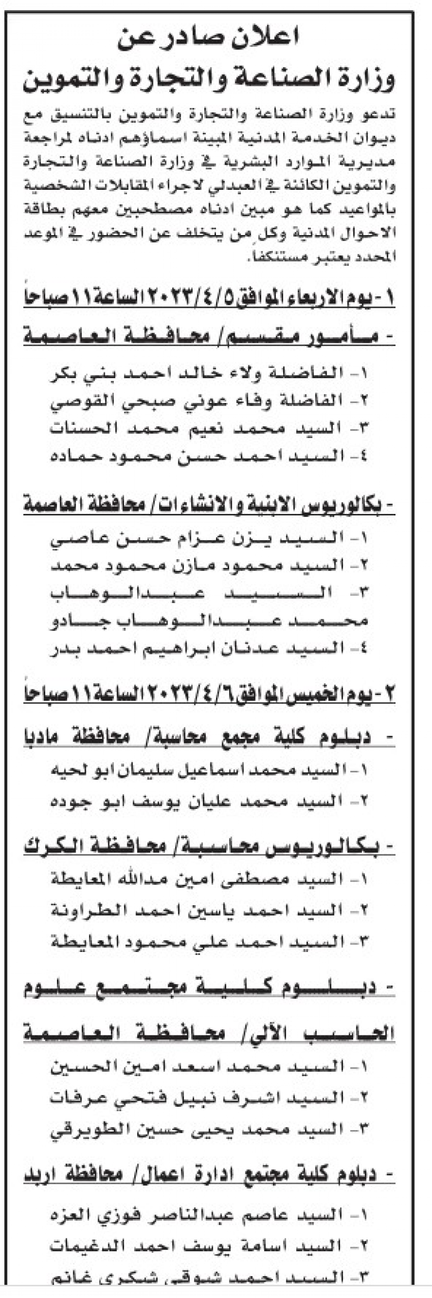 دعا ديوان الخدمة المدنية بالتنسيق مع عدد من الوزارات والمؤسسات الحكومية الأشخاص التالية لإجراء المقابلات الشخصية.