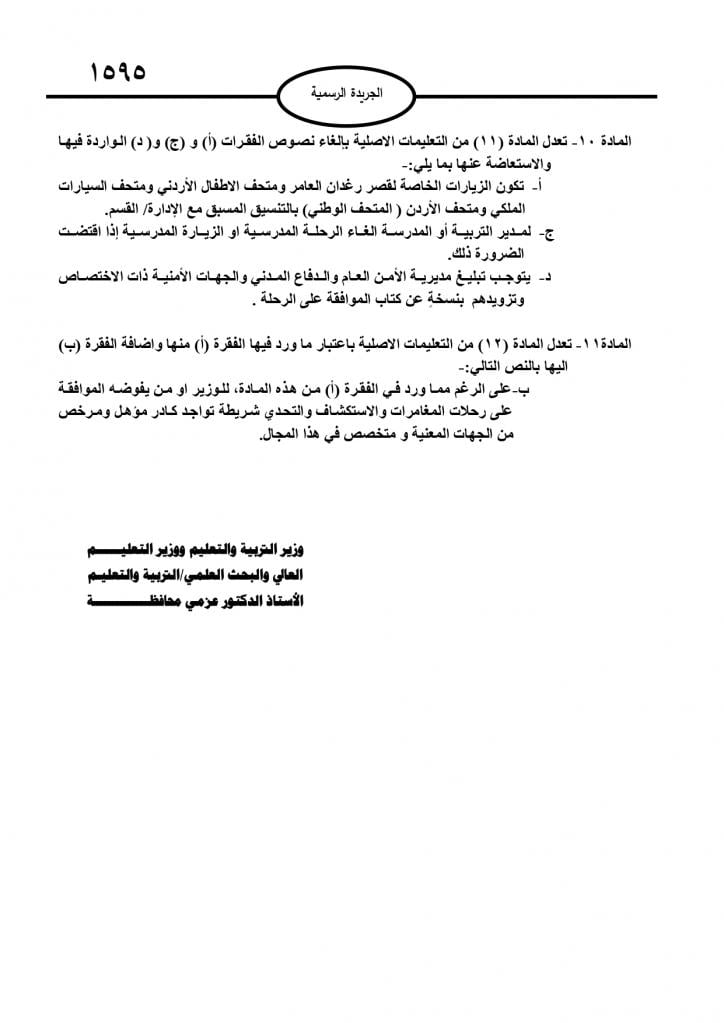 أعلن وزير التربية والتعليم والتعليم العالي والبحث العلمي عزمي محافظة،عن اتخاذ قرار بتعديل تعليمات الرحلات والزيارات المدرسية لطلبة المدارس، وفقا لما نشرته الجريدة الرسمية.