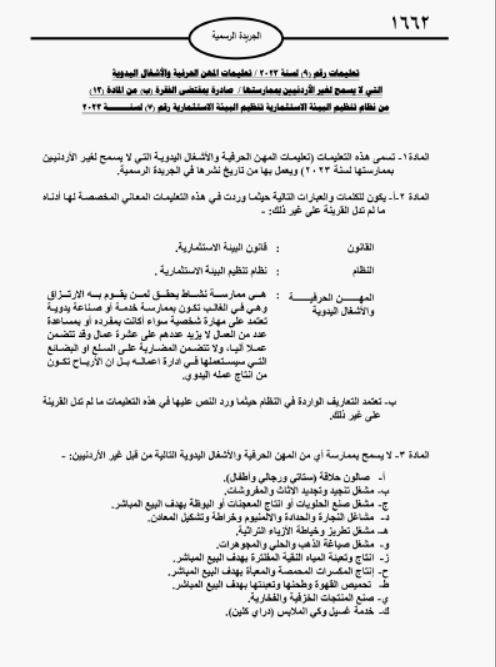 أعلنت الحكومة تعليمات جديدة للمهن الحرفية والأشغال اليدوية التي لا يسمح لغير الأردنيين بممارستها.