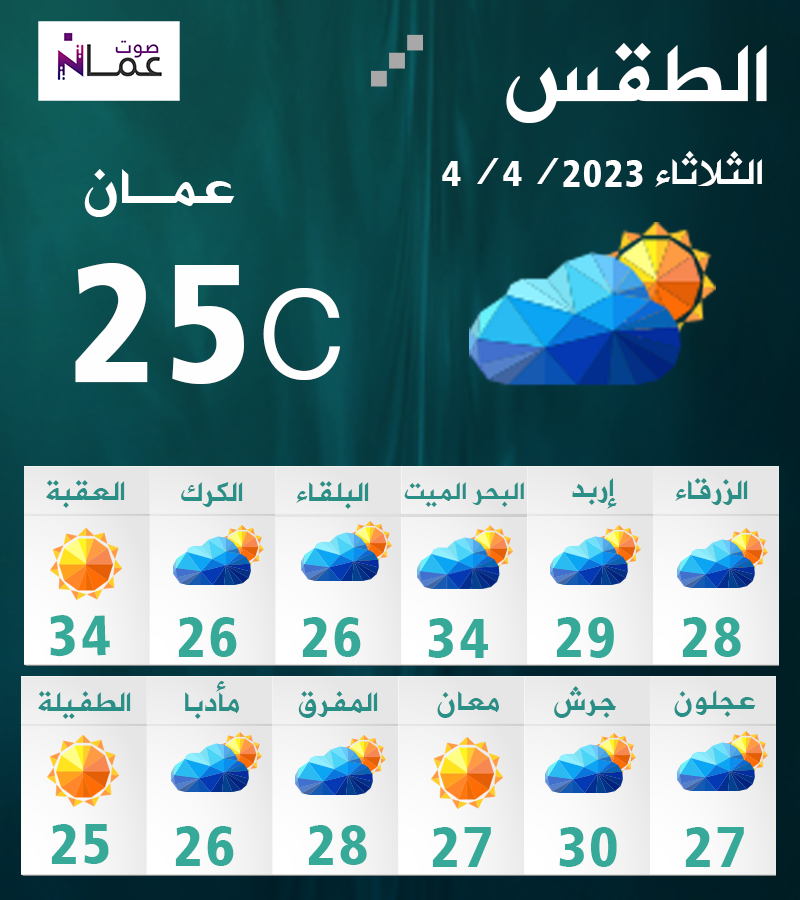 يوم غدٍ الأربعاء، يطرأ انخفاض ملموس على درجات الحرارة، وتكون الأجواء لطيفة الحرارة في أغلب مناطق المملكة، ومعتدلة في الأغوار والبحر الميت والعقبة، مع ظهور بعض الغيوم على ارتفاعات منخفضة، وتكون الرياح شمالية غربية معتدلة السرعة تنشط بين الحين والآخر.