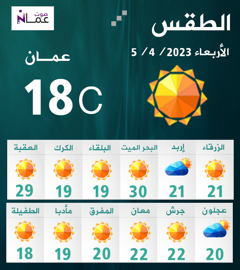 تنخفض درجات الحرارة بشكل ملموس، اليوم الأربعاء، لتسجل أقل من معدلاتها الاعتيادية بحوالي (2-3) درجات مئوية، وتكون الأجواء لطيفة في أغلب مناطق المملكة، ومعتدلة في الأغوار والبحر الميت والعقبة، مع ظهور بعض الغيوم على ارتفاعات منخفضة.