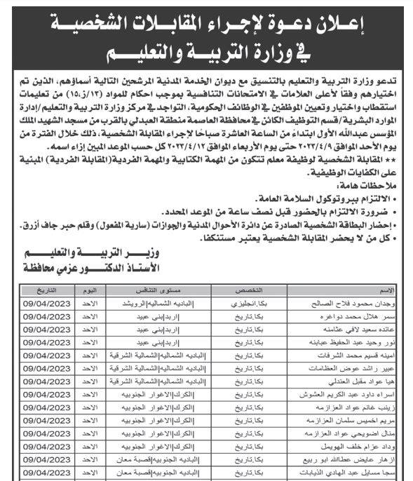 وجهت وزارة التربية والتعليم وبالتنسيق مع ديوان الخدمة المدنية، اليوم الأربعاءدعوة لعدد من المرشحين لإجراء المقابلات الشخصية.