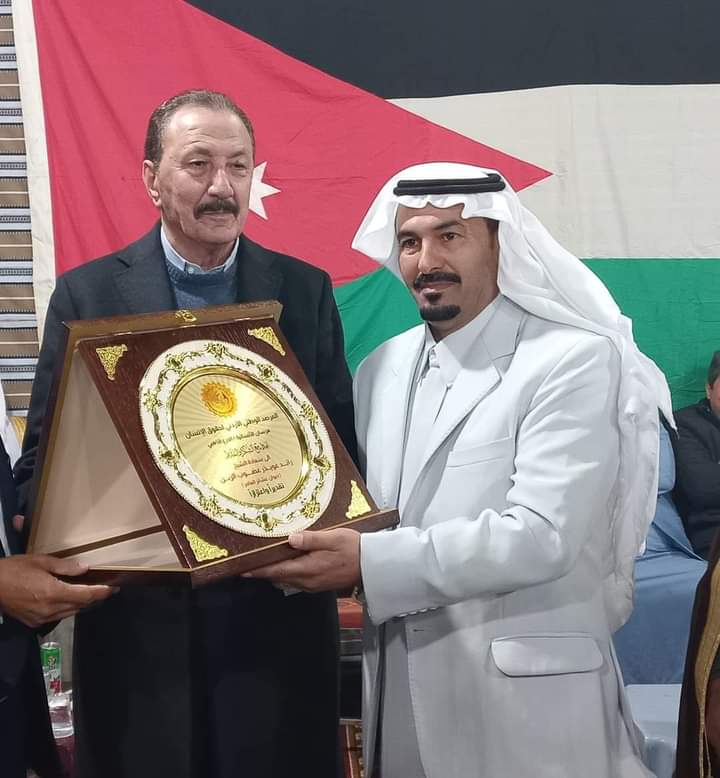 وأكد العفيشات اننا نيابة عن المرصد الوطني الأردني لحقوق الإنسان ممثلا برئيسه العين السابق سامي الخصاونه ونائبه الشيخ عبد الرحيم الجمال نكرم الشيخ راكان عويذر عضوب الزبن والشيخ رائد عويذر عضوب الزبن ونتشرف أن يقوم رئيس هيئة الأركان المشتركة السابق الفريق أول الركن المتقاعد مشعل الزبن بصفته قامة أردنية عسكرية خدمت الوطن والقيادة الهاشمية الحكيمة بإخلاص بتسليم درع فرسان الإنسانية للشيخ رائد عويذر عضوب الزبن ويسلم الشيخ رائد سامي العدوان نيابة عن المرصد الوطني الأردني لحقوق الإنسان درع فرسان الإنسانية للشيخ راكان عويذر عضوب الزبن.