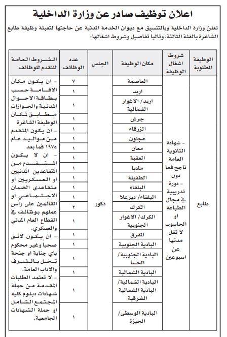 أعلنت وزارة الداخلية، اليوم الخميس، بالتنسيق مع ديوان الخدمة المدنية، عن وظائف شاغرة لديها.