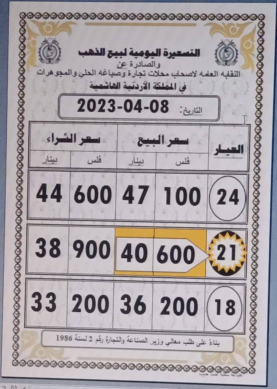 أشار نقيب النقابة العامة لأصحاب محلات تجارة وصياغة الحلي والمجوهرات، ربحي علان، أن أسعار الذهب اليوم السبت مستقرة محلياً .