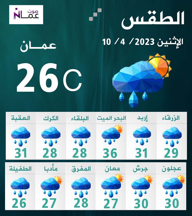 ويتوقع هطول زخات من المطر في أماكن متفرقة من المملكة، واعتبارا من ساعات ما بعد الظهر تصبح الهطولات غزيرة في جنوب المملكة وأجزاء من المناطق الشرقية مصحوبة بالرعد وتساقط زخات من البرد، ما يؤدي إلى تشكل السيول في الأودية والمناطق المنخفضة في المناطق الجنوبية بما فيها مدينة العقبة، وتكون الرياح جنوبية شرقية الى جنوبية غربية نشطة السرعة مثيرة للغبار في العديد من مناطق المملكة.