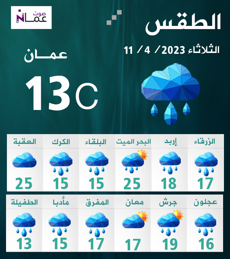 ويطرأ الخميس، ارتفاع قليل على درجات الحرارة، وتكون الاجواء باردة وغائمة جزئياً الى غائمة مع هطول الامطار في شمال ووسط المملكة واجزاء من المناطق الجنوبية والشرقية، وتكون الرياح غربية نشطة السرعة مثيرة للغبار في مناطق البادية.