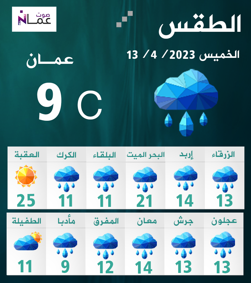 تبقى الأجواء، اليوم الخميس، باردة وغائمة جزئياً إلى غائمة مع هطول الأمطار في شمال ووسط المملكة والمناطق الشرقية، وتكون غزيرة أحيانا في ساعات الصباح في شمال ووسط المملكة وكذلك أجزاء من المناطق الشمالية الشرقية مصحوبة بالرعد وتساقط زخات من البرد التي قد تكون كثيفة في بعض المناطق.