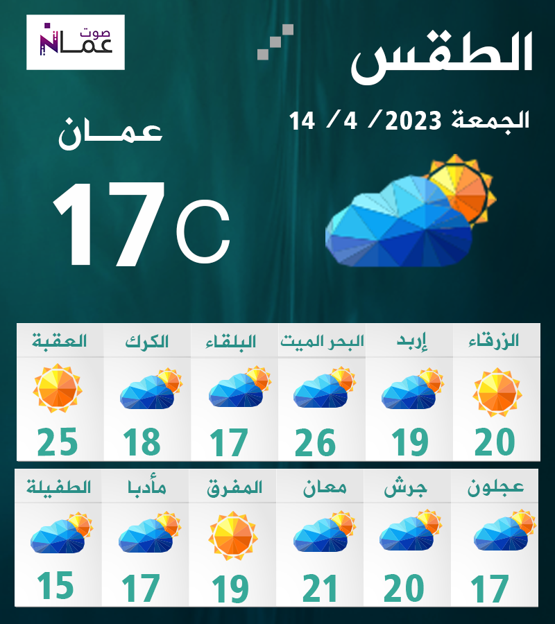 تتأثر المملكة، اليوم الجمعة، بمرتفع جوي، حيث ترتفع درجات الحرارة وتسود أجواء غالباً مشمسة ومستقرة، ولطيفة الحرارة في أغلب المناطق، ودافئة في الأغوار والبحر الميت والعقبة، والرياح شمالية غربية إلى شمالية شرقية معتدلة السرعة.