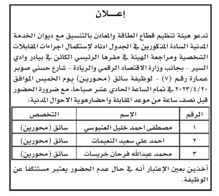 ودعا ديوان الخدمة المدنية بالتنسيق مع عدد من الوزارات والمؤسسات الحكومية الأشخاص التالية لإجراء المقابلات الشخصية.