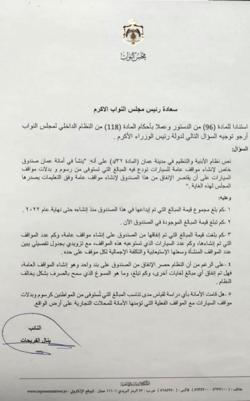 وجه النائب ينال فريحات سؤالاً نيابياً لرئيس الوزراء بخصوص صندوق رسوم وبدلات مواقف السيارات في أمانة عمان، مستفسراً إن كانت الأمانة قد التزمت بنظام الأبنية والتنظيم الذي حصر الإنفاق من الصندوق على إنشاء المواقف أم أنها أنفقت منه لغايات أخرى.