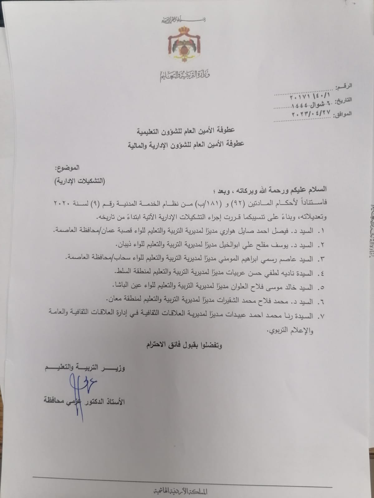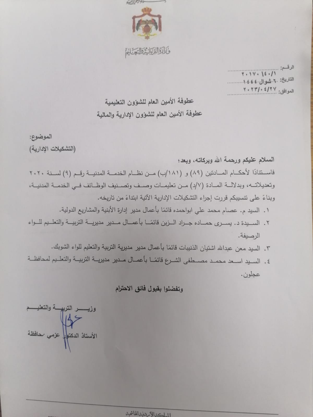 أجرى وزير التربية والتعليم الدكتور عزمي محافظة، تشكيلات إدارية شملت عددا من الموظفين.
